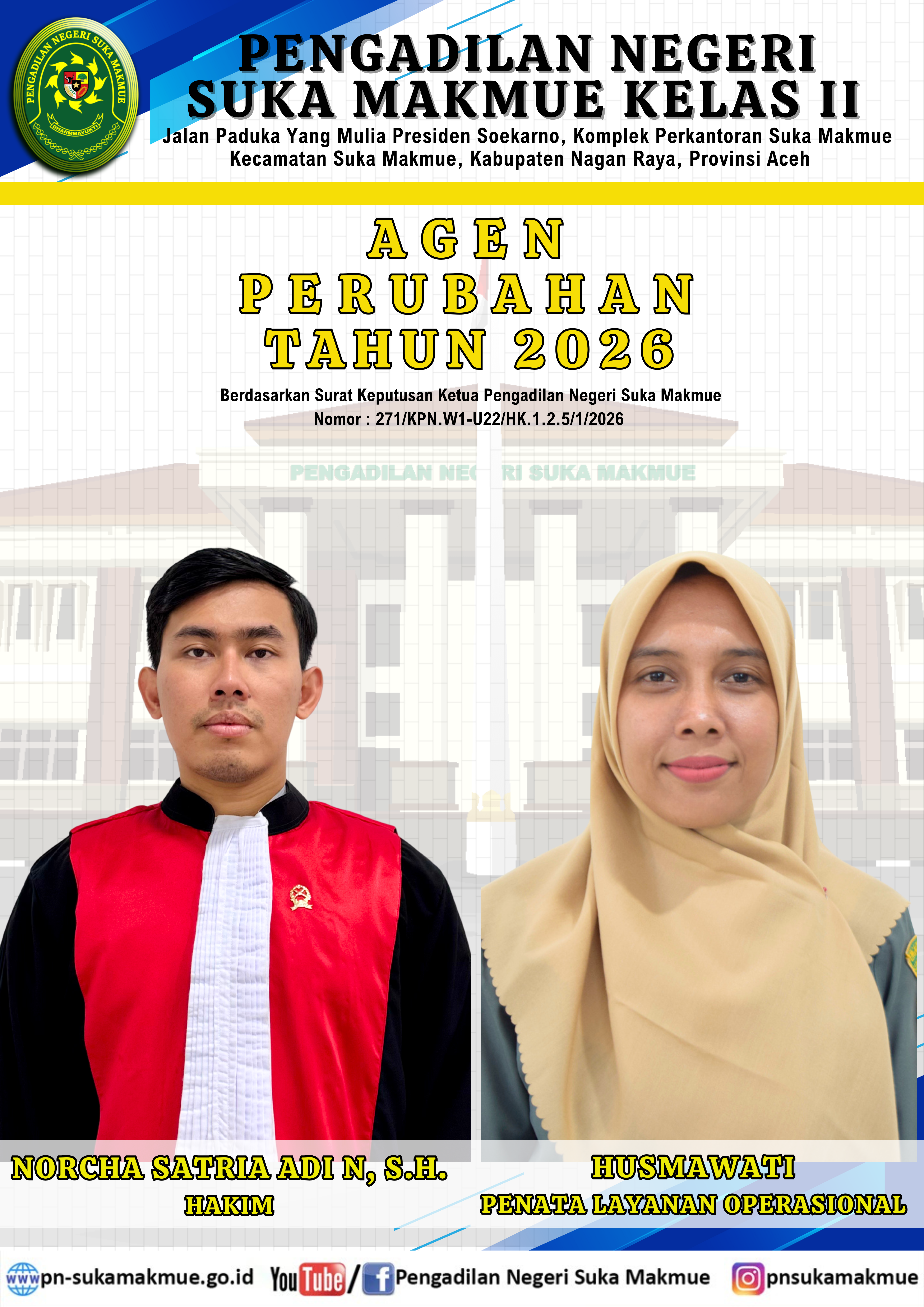 Pengadilan Negeri Suka Makmue saat ini memiliki Agen Perubahan Tahun 2026 yaitu Saudara Norcha Satria Adi Nugroho, S.H. yang merupakan Hakim Pengadilan Negeri Suka Makmue dan saudari Husmawati yang merupakan Penata Layanan Operasional pada Pengadilan Negeri Suka Makmue