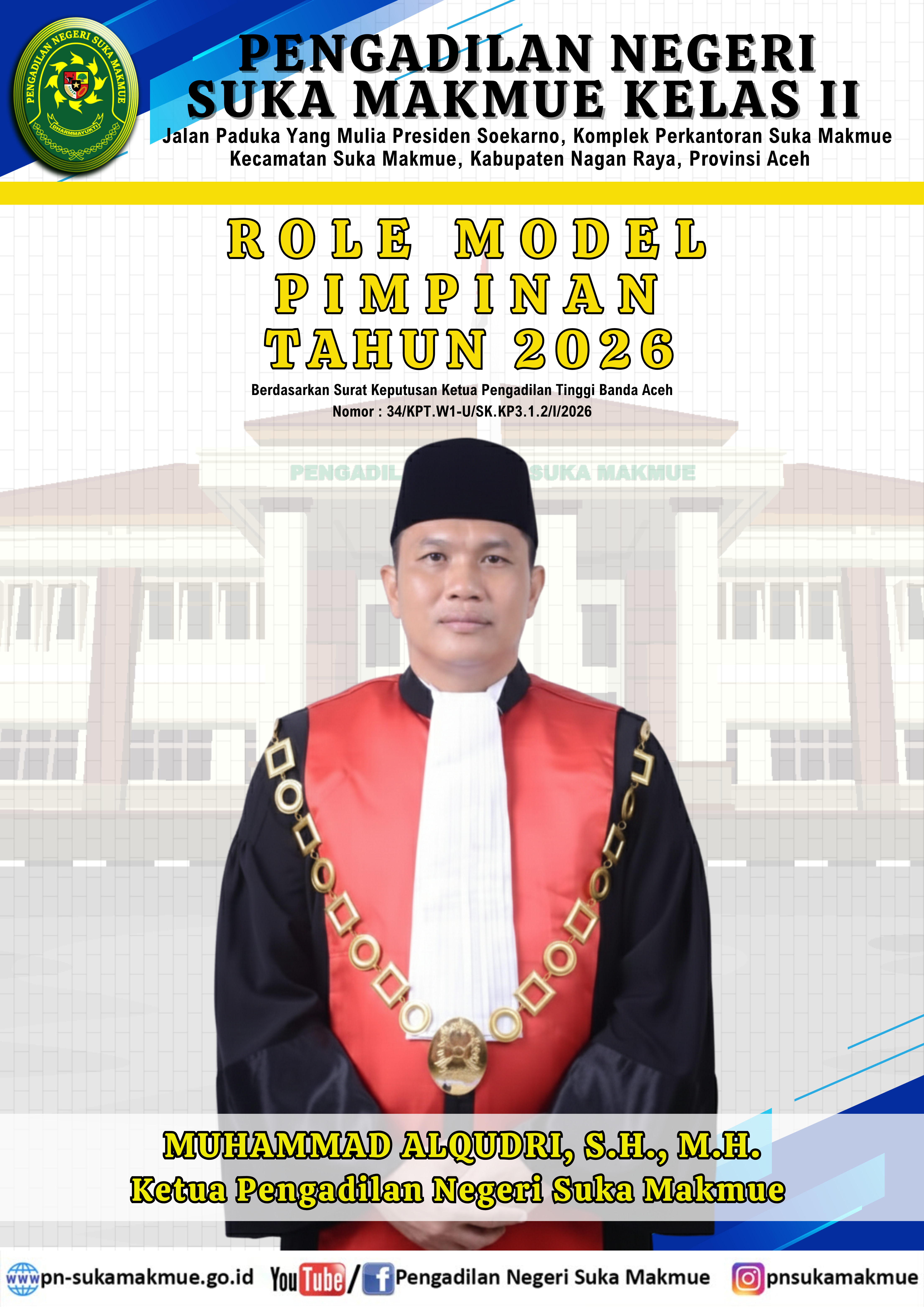 Pengadilan Negeri Suka Makmue saat ini memiliki Role Model Pimpinan yaitu Ketua Pengadilan Negeri Suka Makmue Bapak Muhammad Alqudri, S.H., M.H.